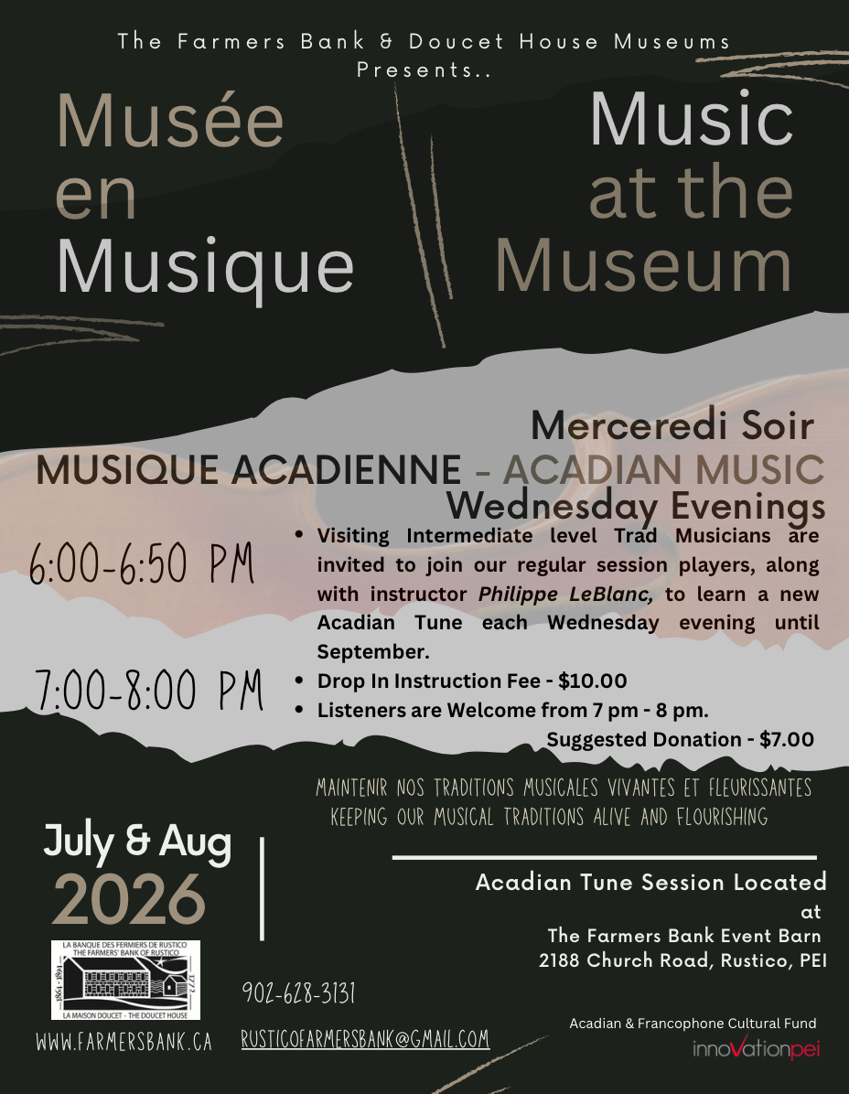 Since 2023, the Farmers’ Bank of Rustico has been developing Music@TheMuseum — a program dedicated to promoting and preserving and promoting the traditional music and song of Prince Edward Island’s Acadian community, designed for adult learners at the intermediate level.